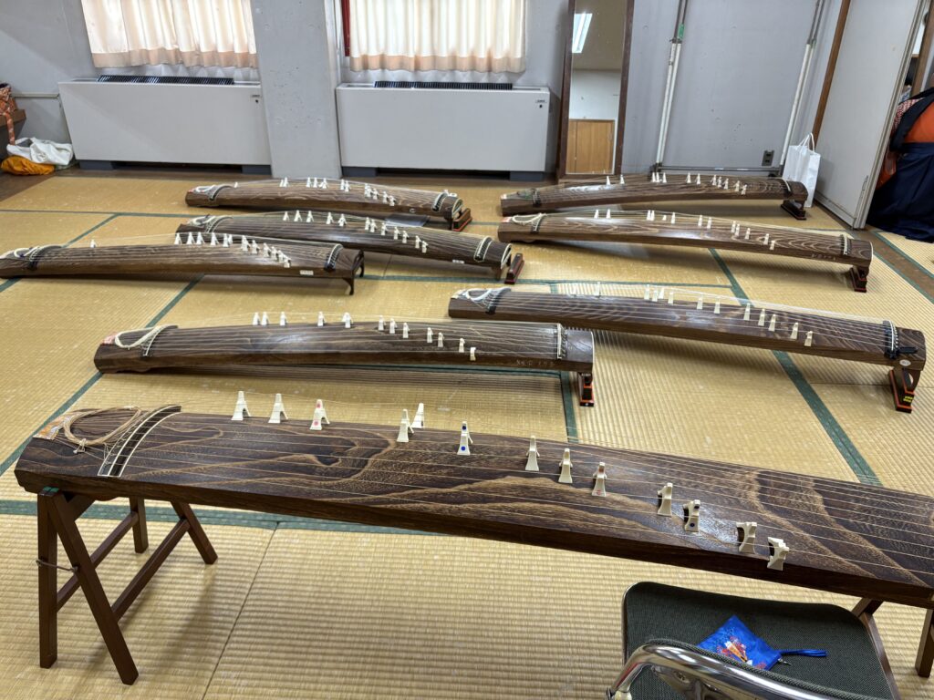 生徒2人は、コンクール発表会に三線での出演経験はあるものの、筝曲では初めてであり、かつ教室仲間以外の箏奏者もいる舞台が初めてでした。お借りした箏と道具がバラバラにならないようにしたり、楽屋でたくさんの音が聞こえるなかで調弦や練習をしたりといった、大きな舞台ならではの注意点を伝える、指導の場でもありました。また足の調子の悪い生徒さんのために、生徒さんの出番には箏の舞台への上げ下げも担いました。